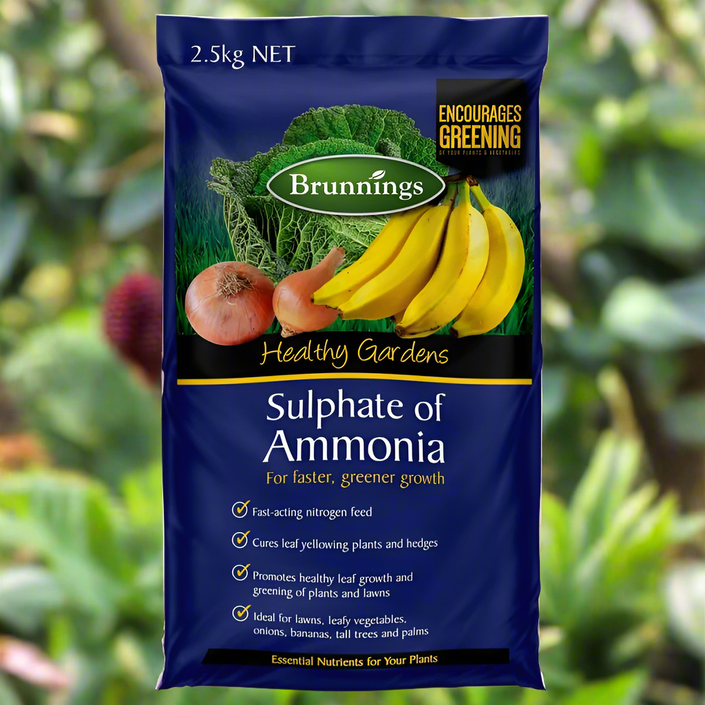 Brunnings Sulphate of Ammonia is a rich nitrogen fertiliser which encourages and stimulates healthy leaf growth in all plants and especially leaf crop vegetables and lawns. Sulphate of Ammonia is fast acting and may be applied dry or in soluble form for a more even result on lawns. It is also effective for most plants with yellow-leaf symptoms.