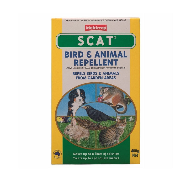 Scat is a water-soluble powder developed to repel birds and animals from eating valuable fruit crops and ornamentals. Its bitter taste deters a wide variety of birdlife, domestic pets, rats, possums, and rabbits. While not 100% effective in every situation—since all birds and animals react differently to environmental pressures—persistence is key to success. Scat is most effective when used alongside other methods, such as providing an alternative food source for the animals. -