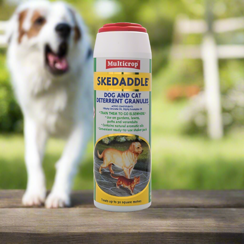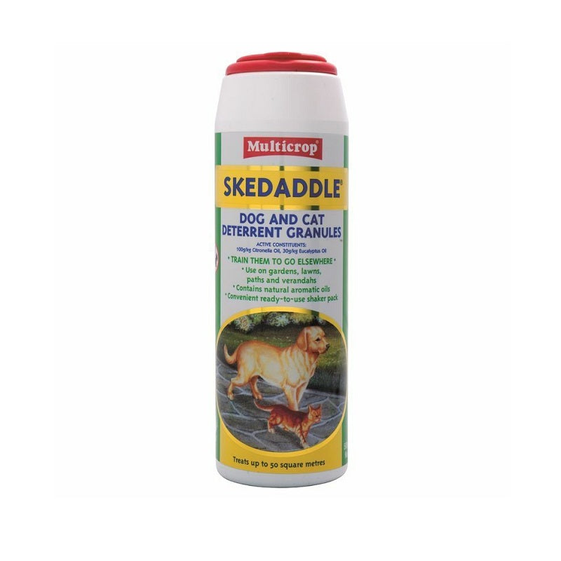 Multicrop Skedaddle Dog and Cat Deterrent Granules are a natural, non-toxic combination of aromatic oils that effectively deter dogs and cats. They are safe and easy to use and are an ideal training aid for a wide variety of situations. Multicrop Skedaddle Dog and Cat Deterrent Granules provide a new means, using a new active ingredient, for training dogs and cats to a preferable behaviour.