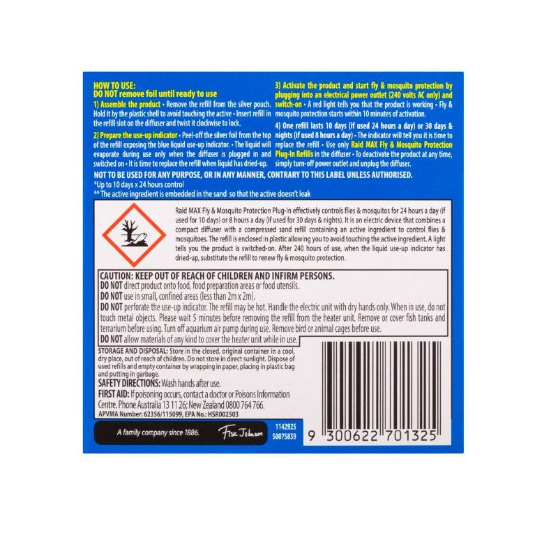 Experience extended protection with the Raid MAX Fly and Mosquito Protection Plug-In refill. Enjoy over 200 hours of continuous defence, day and night, against flies and mosquitoes. Safeguard your space from flying insects, even with windows open.