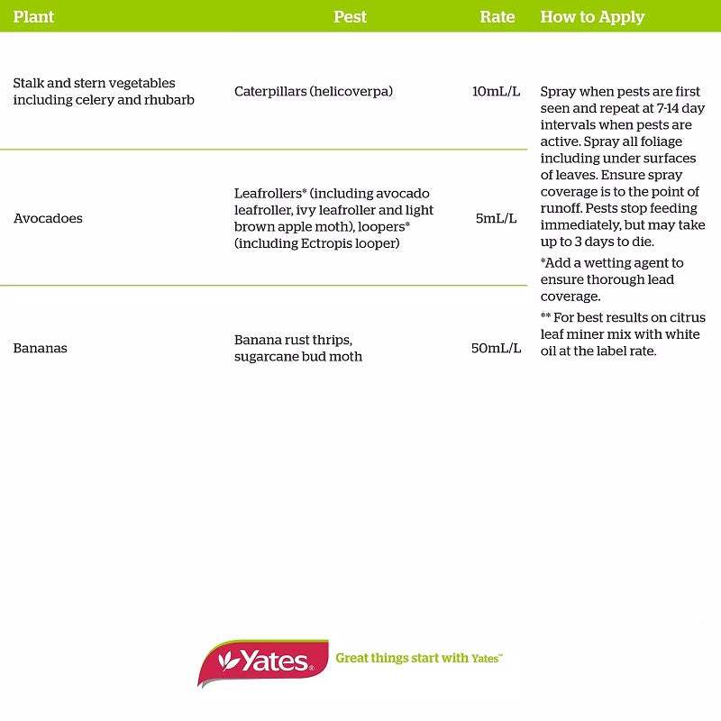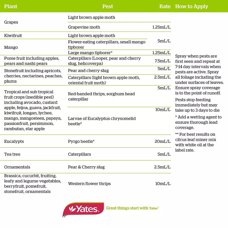 Contains spinetoram, a new generation insecticide derived from beneficial soil bacteria for control of caterpillars, thrips, codling moth, pear & cherry slug and other leaf eating insects. This is the next generation solution replacing Success Naturalyte, Success ULTRA. The spinetoram has translaminar action, which enables it to move from the upper to lower leaf surfaces, helping to make it rainfast.