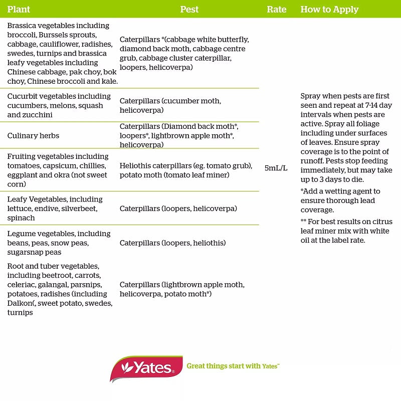 - Spray when pests are first seen and repeat at 7-14 day intervals when pests are active. Spray all foliage including the under surfaces of leaves. Ensure spray coverage is to the point of runoff.