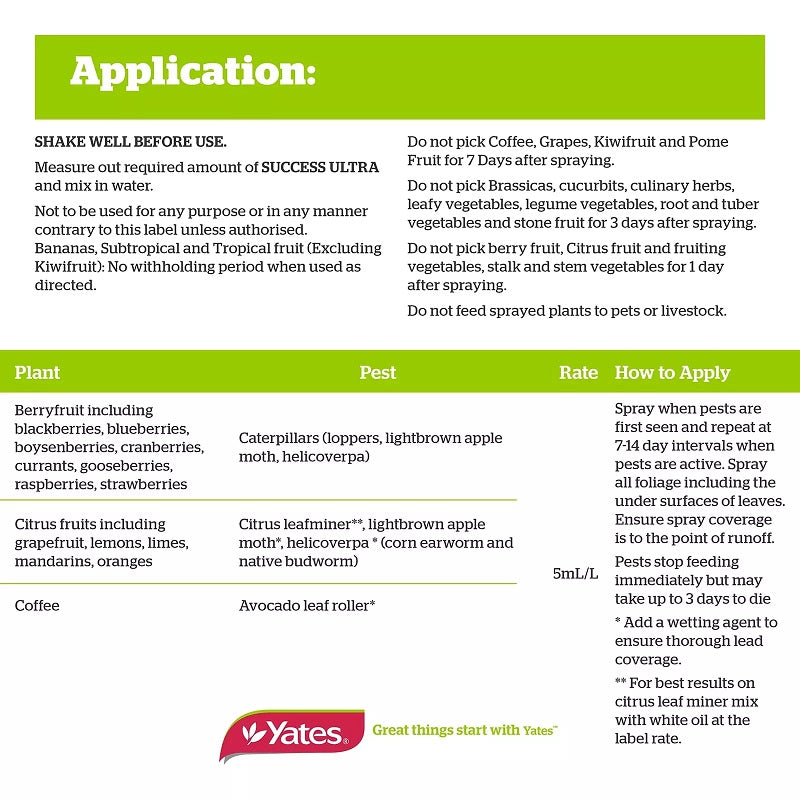 - Yates Success Ultra is suitable for use on a wide range of vegetables, fruit, herbs and ornamentals